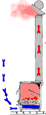 Quando accendiamo la stufa, i fumi caldi prodotti dalla combustione si espandono in virtù della loro alta temperatura, il volume di gas contenuto nel camino diminuisce di densità, e l’aria esterna più pesante tende a prenderne il posto, passando attraverso la stufa. In questo modo viene anche fornito ossigeno alla combustione, che può proseguire finché non esaurisce il combustibile. Continuando a fornire combustibile, si può far proseguire indefinitamente il processo.